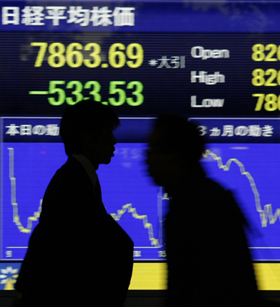 12月2日,人們從日本東京一塊股價顯示牌前走過。受前一個交易日紐約股市暴跌和日元升值等因素影響,日本東京股市日經股指2日收盤時下跌6.35%。