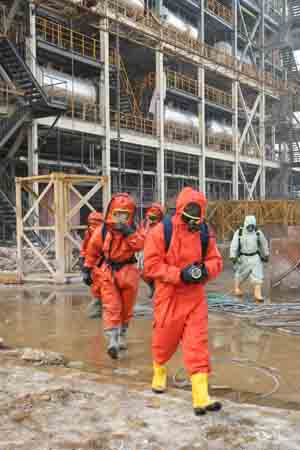 12月10日,消防官兵在南玻公司三氯氫硅泄漏事故現場排險。