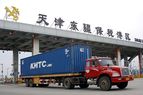 12月10日,一輛運輸集裝箱的貨車從天津東疆保稅港區駛出。