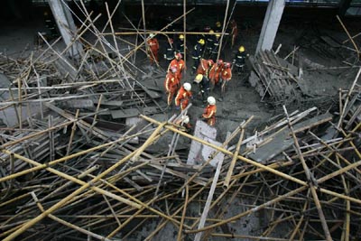 12月21日,消防官兵在現場搶救受傷人員。 當日上午10時13分,上海市奉賢區一在建廠房發生局部倒塌事故。截至記者發稿時止,事故已造成1人死亡;另有9人受傷,其中2人傷勢非常嚴重,生命垂危,已被送往醫院救治。死傷者均為現場施工工人。