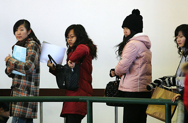 幾位女大學生手捧簡歷排隊等候入場。