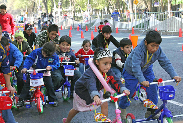 28日,在墨西哥首都墨西哥城的改革大道上,孩子們參加騎小三輪車比賽。組織者希望通過這次活動豐富孩子們節假日的生活。
