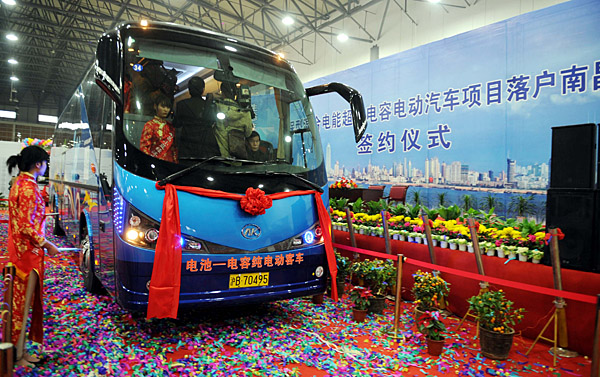 12月29日,來自上海瑞華(集團)有限公司的環保型電動客車在南昌舉行的簽約儀式上亮相。