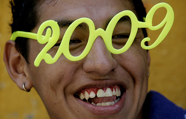 29日,在秘魯首都利馬的一個市場,售賣新年裝飾的小販戴著“2009”字樣的黃色眼鏡。黃顏色在秘魯有新年吉祥的意味,所以黃色的裝飾物在節慶市場特別走俏。新華社/路透