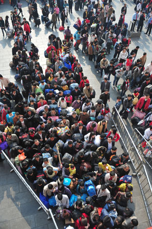 1月7日,廣州火車站廣場上乘客排隊進站。
