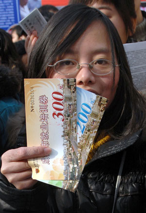 當日,成都市正式向315名失業返鄉農民工、2008屆以前未就業大中專畢業生和因企業停產或者經濟性裁員而新增的就業轉失業等三類人員,發放了價值15.75萬元的就業培訓券。這些持券者可以在2009年12月31日前,在政府選定的173家定點培訓機構中自主從110多項專業技能培訓中選擇自己要參加的培訓專業。預計全市將向2360余人發放價值118萬元的就業培訓券。