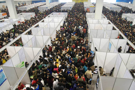 1月18日,無錫市畢業生雙選會現場人頭攢動。當日,2009年無錫市畢業生雙選交流會暨大型人才交流會在無錫市體育中心舉行,300多家用人單位進場招聘,為求職者提供了3000多個崗位,吸引了約1.8萬名學子前來求職。