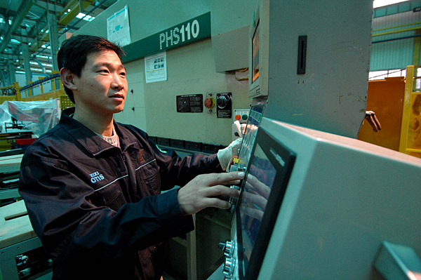 日前,留守在杭州西子奧的斯電梯有限公司的安徽籍機床技工武杰峰在生產車間檢修和保養設備。