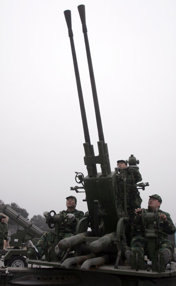 2月1日傍晚,河南省洛陽市孟津縣人工影響天氣作業基地的工作人員移動高炮和火箭發射架進入作業狀態。