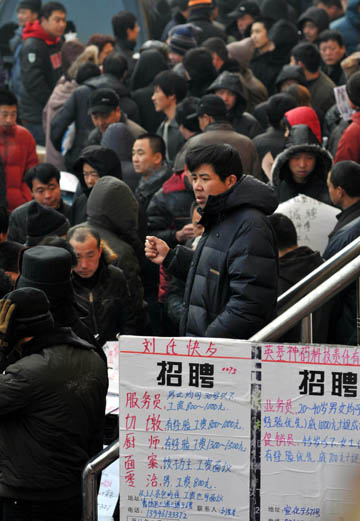 2月1日,求職者在哈爾濱市撫順街上的人才市場尋找工作崗位。