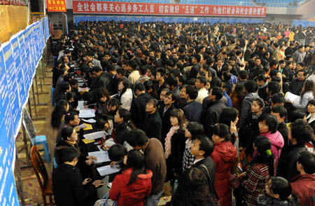 當日,安徽省蚌埠市懷遠縣政府在縣勞動力市場舉辦2009年首場大型春季企業用工暨返鄉農民工現場招聘會,該縣的120余家企業為返鄉農民工提供就業崗位3000多個。新華社發(葉勝利攝)