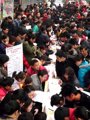 2月4日,招聘會現場擠滿眾多求職者。當日,江西新余市2009年就業和再就業新春招聘大會開幕。本次招聘會勞動保障部門組織了200多家用人單位前來招聘,主要針對返鄉務工人員、就業困難人員和登記失業的大中專畢業生等。 新華社記者:宋振平 攝