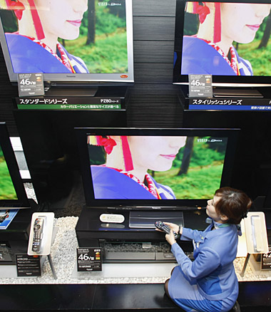 2月4日,在日本東京,一名松下公司員工在產品展廳內工作。日本電器制造業巨頭松下電器產業公司當日宣布,公司面臨6年來首度虧損,打算在全球范圍內裁員大約1.5萬人,關閉27家工廠。新華社/路透