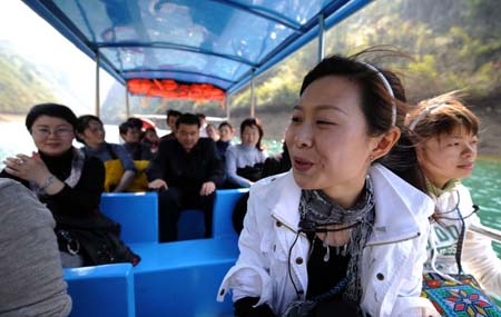 2月11日,黃華英在渡船上與游客交談。 當日,應聘到張家界大峽谷景區擔任講解員的湖南省張家界市慈利縣三官寺鄉返鄉農民工黃華英帶著一批游客在景區內游覽。黃華英是張家界大峽谷景區已招聘錄用的17名返鄉農民工之一,此前她曾在廣東東莞一家印刷廠打工,2008年回到家鄉。 目前,張家界大峽谷景區講解員招聘工作仍在與景區建設同步進行中,景區管理層表示“在同等條件下優先聘用返鄉農民工”,為返鄉農民工提供就業機會。
