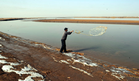 2月11日,一位打魚人在黃河邊撒網。寧夏回族自治區水利廳發布的信息表明,由于氣候干旱,并根據長期徑流預報,2008年11月至2009年6月黃河流域主要來水區來水153.9億立方米,比往年同期均值偏少20%。