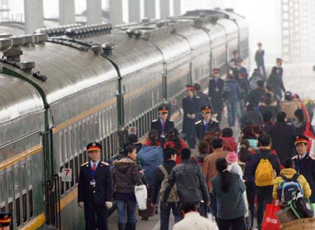 2月16日,旅客在重慶北站站臺上行進。 2月17日,重慶火車站最新公布的統計數據顯示,截至2月16日,該站節后春運共發送旅客125.3萬人,比去年同比增長25.9%,其中發送直通旅客79.7萬人,比去年同比增長16.8%,發送管內旅客45.6萬人,比去年同比增長45.6%。