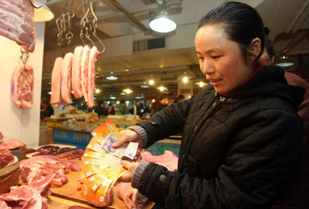 2月18日,在杭州市仙林苑農貿市場,一位市民準備用剛領到的農貿市場消費券購買豬肉。當日,杭州市下城區部分困難家庭領到了社區附近農貿市場發放的專用消費券,持券家庭可在指定農貿市場內購買糧、油、菜等。1月底,杭州市部分農貿市場率先發放農貿市場專用消費券,惠及杭州市、區兩級低保、困難家庭。從2月18日開始的第二批消費券發放活動,參與這項活動的農貿市場和受惠家庭范圍都有所擴大。