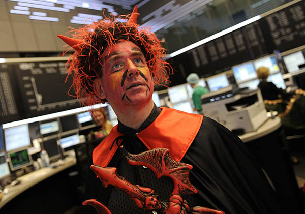 24日,在德國法蘭克福的證券交易所,一名交易員身著魔鬼造型的服裝工作。盡管金融危機下的德國DAX股指于23日降至2004年10月底以來的最低點,人們依然將各種狂歡節元素帶進證券交易所,以免錯過一年一度的德國狂歡節盛宴。新華社/路透