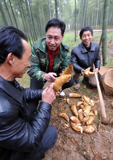 2月24日,陳永華(中)與當地農民一道在竹林中挖采竹筍。 曾在南開大學獲得世界經濟學博士學位的陳永華,2005年放棄在天津市一家證券公司總監的職位,回到家鄉安徽省廣德縣投身現代農業,創辦了潤華生態林業公司,建成了1.5萬畝優質高效豐產竹林。陳永華組織林農在竹林間栽培竹蓀、套種山芋、套養竹林雞、投建竹筍加工廠,發展竹林經濟,為當地農民提供固定就業崗位150個,季節性用工最多時每天達到上千人,每年為農民提供山場租賃費和勞務收入1000萬元。