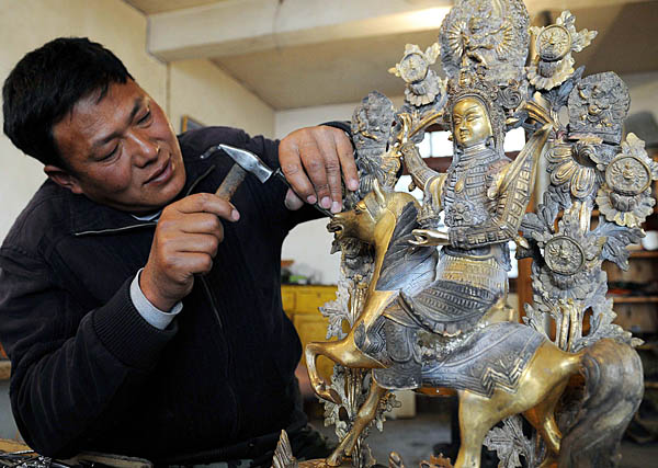 云南省迪慶藏族自治州德欽縣升平鎮藏族手工藝人、獲得“云南省工藝美術大師”稱號的洛桑扎西在制作銅制工藝品。近年來,地處云南省西北部的迪慶藏族自治州大力發展具有民族特色的手工藝制作業,將唐卡、銅雕、藏飾等特色產品推向市場。如今在一些鄉鎮已形成“家家有手藝,戶戶是工廠”的格局。