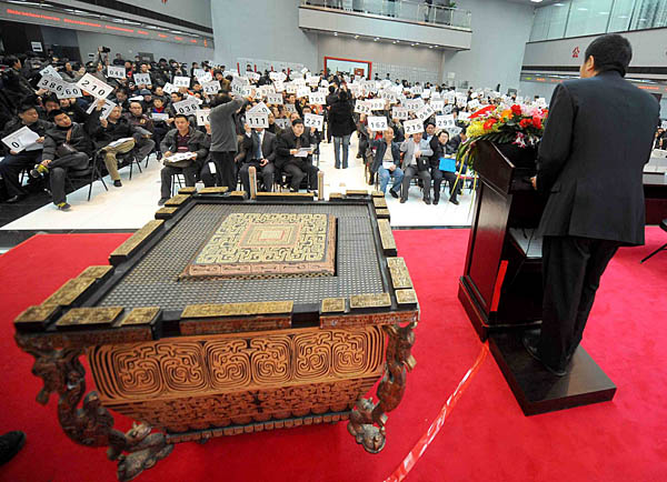 3月8日,“2008北京第29屆奧運會開幕式演出道具‘缶’專場拍賣會”在北京產權交易所落槌。首個標的共十個缶以1.3萬元總價起拍,經過近百輪激烈競價,最終以70.6萬元被347號買家競得。據介紹,當日有1000只缶約53個標的投入競拍,共有439家單位和個人報名參與了現場競買。