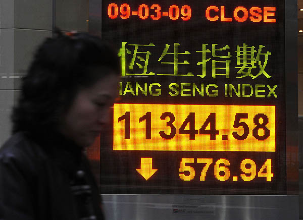 3月9日,一名婦女從香港灣仔恒生指數電子顯示屏前走過。當日,香港恒生指數下跌576.94點,收報11344.58點,跌幅為4.84%。