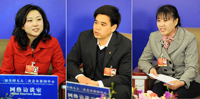 他們是農民工的代言人,他們傳遞著農民工的心聲。兩會上,他們為農民工這個群體呼吁奔走,讓更多的人來關注、關心、關愛這個群體。 為了匯聚工友們的心聲,從2008年當選全國人大代表以來,康厚明、朱雪芹、胡小燕3位農民工代表的生活變得不同尋常,聆聽、反映農民工心聲成為他們的最大心愿。 (左圖)3月10日,全國人大代表、上海華日服裝有限公司團支部書記、工會副主席朱雪芹與網民在線交流。她說,當了代表以后,有很多農民工打電話給我,也備受媒體的關注,我們感受到了社會各界對農民工群體的關注。我們不孤單。 (中圖)3月10日,全國人大代表、重慶城建集團市政一公司路面處農工班班長康厚明與網民在線交流。他說,很多工友向我反映社會養老保險問題,這是我們農民工最關注的。我一定會一心一意為農民工反映這個問題。目前這個問題已經得到了國家的重視。 (右圖)3月10日,全國人大代表、廣東省佛山市三水新明珠建陶工業有限公司成品車間副主任胡小燕與網民在線交流。她說,希望政府能加大對農民工培訓和回鄉創業的扶持力度,進一步完善社保制度,解決社會保險關系異地轉移等問題。 |