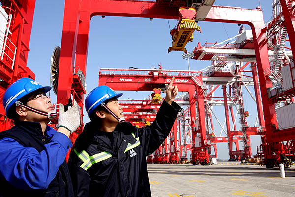 3月16日,兩名工作人員在天津港新建集裝箱碼頭上查看設備安裝情況。