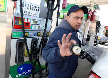 3月17日,在美國紐約的一個加油站,工人在為顧客加油。當日,受到積極經濟數據以及紐約股市強勁上漲的刺激,國際油價大幅上揚近4%,收在每桶49美元之上,創下去年12月以來最高收盤價。