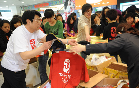 3月19日,在北京藍島大廈,顧客們選購降價促銷的奧運商品。由于奧運特許商品即將退市,眾多商家降價促銷,引來顧客紛紛搶購。