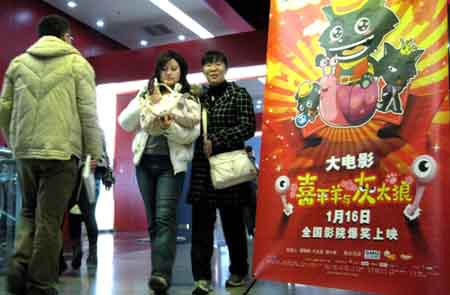 國產動畫片逆風飛揚,“喜羊羊”票房突破八千萬。在北京首都電影院,觀眾走過《喜羊羊與灰太狼之牛氣沖天》電影海報展板。
