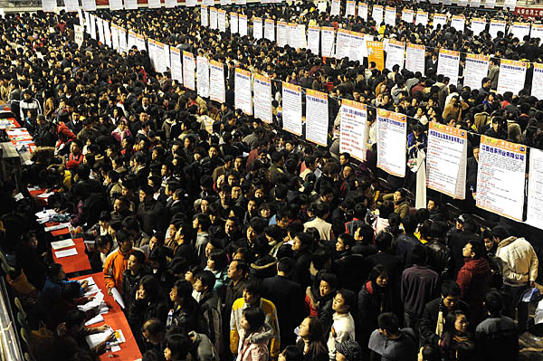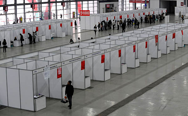 2月21日至22日,由江西省企業聯合會、江西省企業家協會等主辦的“江西省2009年春季大型人才交流會暨華東高校人才網現場招聘會”,在南昌國際展覽中心舉行。包括沃爾瑪、百事可樂等200余家省內外大型企業現場招聘英才。據主辦方預計,屆時求職者人數將超過2萬人。 主辦方的愿望雖好,但記者看到招聘會是空前遇“冷”,現場非常冷清,前來的求職者寥寥無幾。由于參與招聘的企業單位倉促上陣,準備不足,近半用人單位攤位空空無人。不少買了門票進館前來應聘的大中院校學生怨聲載道。 然而,同在南昌市,同樣是下雨天,僅相差一周的2月28日,由南昌市委組織部等部門在江西省體育館舉辦的一場大型招聘會是決然不同,由于主辦方做了精心的準備,有近200家企業入場招賢納才,并求職者一律免費入場。 2月28日,招聘會現場擠滿眾多的求職者。 | |