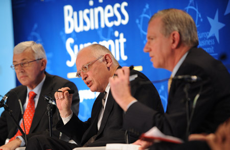 3月26日,在比利時首都布魯塞爾,歐盟委員會負責企業和工業事務的副主席京特·費爾霍伊根(中)在歐洲商務峰會上發言。當天,為期兩天的第七屆歐洲商務峰會在布魯塞爾開幕。100多位全球著名企業高層人士和歐盟相關領導人將在峰會發言,參與討論全球經濟、貿易、發展等熱門議題。