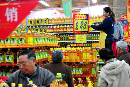 3月30日,一名超市工作人員正在調整食用油價簽。 近日,青島市食用油市場開始大規模降價銷售。此次降價幾乎涉及所有的食用油種類,平均降價幅度在30%左右,最大降價幅度接近50%。據業內人士分析,此次降價是受到銷售市場冷清及原料價格下滑等多種因素影響,價格可能在4月份趨于穩定,5月份開始小幅回升。