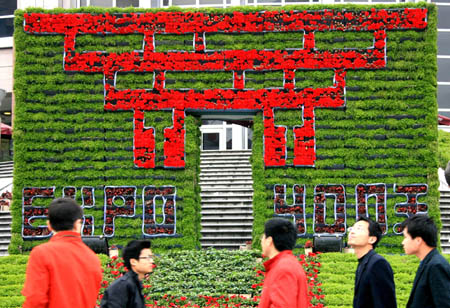 3月31日,一些游客從鮮花墻前走過。當日,即將揭幕的上海春季花展外景“世博鮮花墻”在上海中心城區徐家匯亮相。鮮花墻由中國主題館造型和倒計時400天字樣組成,表達了上海人民的“世博情”,提醒人們2010年上海世博會的腳步越來越近。