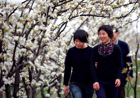 4月1日,幾位游人在傅家邊農業科技園的梨園內觀賞梨花。 南京市溧水縣洪藍鎮傅家邊村地處丘陵地帶,原來是有名的貧困山村。近10年來,傅家邊農業科技園獲得政府項目資金3000余萬元,引進企業投資8000萬元,帶動農民自主投資4000萬元,形成了南京地區小有名氣的旅游品牌。