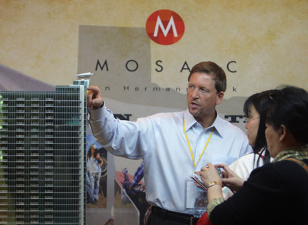 4月12日,來自美國馬賽克公司的經銷總經理托馬斯(左)在向中國消費者介紹他們的房子。4月10日至12日,美中房地產展示交易會在北京召開,該交易會由美中貿易發展協會等單位組織,70多家美國開發商和中介機構參加交易會。據主辦方預計在3天時間內,會有500多套住宅意向成交。