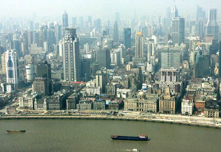 上海黃浦江邊的外灘金融街鳥瞰(3月25日攝)。 上海市商務委員會4月11日發布的信息顯示,雖然遭遇金融危機,但2009年一季度上海外向型經濟發展好于預期,實到外資23.2億美元,比2008年同期增長2.3%,總體情況略好于周邊地區及全國平均水平。