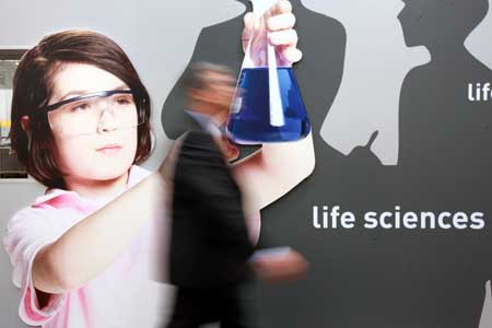 20日,一名參觀者在德國漢諾威工業展上經過一幅“生命科學”的宣傳海報。全球最大的工業博覽會漢諾威工業展當日向公眾開放,來自61個國家和地區的6150家參展商將展示自己的最新產品和研發理念。