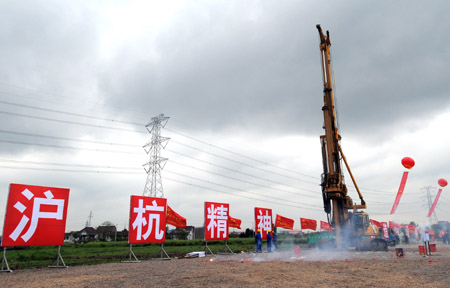 4月20日,在浙江嘉興市大橋村步云特大橋工地上,旋挖鉆機開鉆滬杭鐵路客運專線全線第一樁樁孔。滬杭鐵路客運專線是國家鐵路“十一五”規劃中滬杭甬客運專線的一部分,由上海虹橋站至杭州東站,線路長158.5公里,設計時速每小時350公里,項目投資總額為276.3億元。預計2010年國慶通車,屆時上海至杭州可在40分鐘內到達。