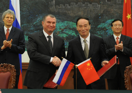 4月21日,國務院副總理王岐山在北京人民大會堂同俄羅斯副總理謝欽舉行中俄能源談判代表第四次會晤,共同簽署了《中俄石油領域合作政府間協議》,雙方管道建設、原油貿易、貸款等一攬子合作協議隨即生效。
