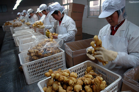 4月22日,在山東省日照市的一個生姜加工車間內,工人們在加工生姜。 日照生姜曾因不符合要求于2006年終止出口日本。近幾年,當地通過實施基地建設、農資統一配送、科學儲存等措施,生姜達到出口要求,近日恢復了對日本出口。