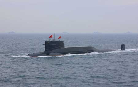 4月23日,中國海軍核動力潛艇在接受檢閱。新華社記者:查春明 攝