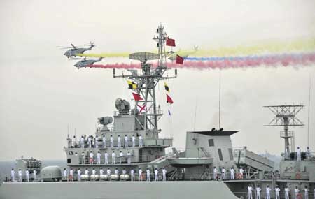 4月23日,中共中央總書記、國家主席、中央軍委主席胡錦濤在青島出席慶祝人民海軍成立60周年海上閱兵活動。這是胡錦濤主席熱情地向受閱艦艇官兵揮手致意。 中方受閱部隊共計25艘艦艇、31架飛機。它們全部是中國自主研制的裝備,其中核動力潛艇、“蘭州”號導彈驅逐艦等是中國海軍的最新型裝備。 來自俄羅斯、美國、法國、印度、韓國等14個國家的21艘軍艦按照作戰艦艇、登陸艦艇、輔助船、訓練艦的先后順序和噸位大小錨泊在預定海域,接受了檢閱。新華社記者:王建民