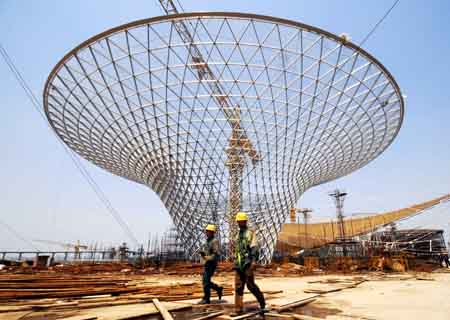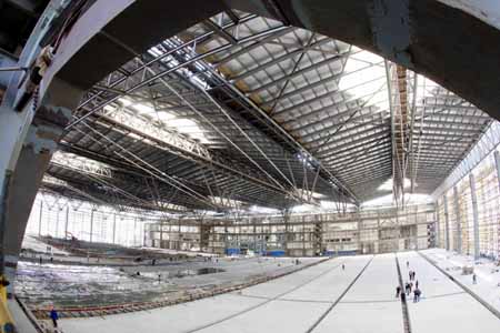 4月26日,施工人員在上海世博會主題館西展廳進行內部裝飾施工。目前,上海世博會主題館西展廳建成,進入到內部裝飾施工階段。世博會主題館西展廳南北跨180米,東西跨126米,矩形的超大跨度無柱空間創國內之最。