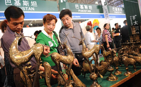6月7日,市民在巴基斯坦展區選購精美工藝品。 在昆明舉行的第二屆南亞國家商品展設置展位300個,涵蓋了紡織服裝、礦業資源、醫療制藥、傳統工藝、輕工建材等10個類別。來自南亞國家的精美商品在展會上受到客商和市民歡迎。