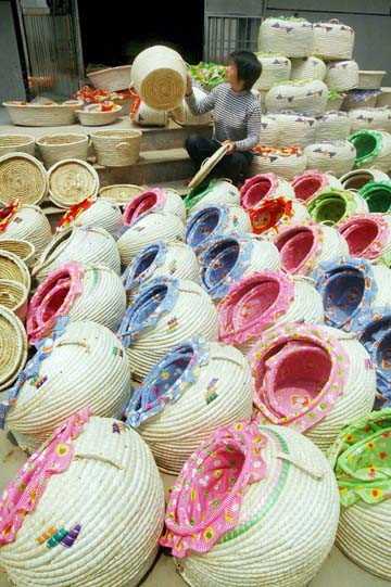 6月7日,山東省郯城縣馬頭鎮農民在晾曬“秸稈工藝品”。該鎮農民把小麥秸稈、玉米皮等晾曬消毒后加工成“秸稈工藝品”,出口歐美及東南亞各國,既避免了秸稈焚燒造成的環境污染,又可為當地農民增收。 新華社發