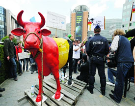 6月18日,在比利時首都布魯塞爾,奶農在歐盟總部外示威。當日,近千名來自德國、比利時等歐盟國家的奶農聚集在歐盟總部外舉行示威游行,要求維護奶農的利益,阻止牛奶收購價格的進一步下跌。
