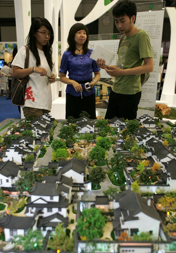 6月25日,參觀者在北京夏季房展上了解一處蘇州園林式參展項目。 當日,中國國際休閑度假地產博覽會暨2009北京夏季房地產展示交易會在北京中國國際貿易中心開展。本屆夏季房展以“升級置業、生態宜居、濱海度假”為主題,來自海南、山東、四川、天津等旅游資源豐富地區的休閑度假地產項目成為展會亮點。