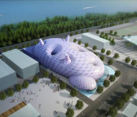 截至7月1日,累計已有191個國家和48個國際組織確認參展上海世博會,其中21個國家尚未與中國建交。落戶世博園區的國家、國際組織和外國城市案例展館將超過100個。圖為日本館的弧形穹頂造型猶如蠶繭(效果圖)。